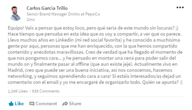 Como Linkedin es la red social que más utiliza Carlos desde hace años y le ha permitido conocer a muchísima gente, decidió escribir un post proponiendo una cena para ponerse cara.